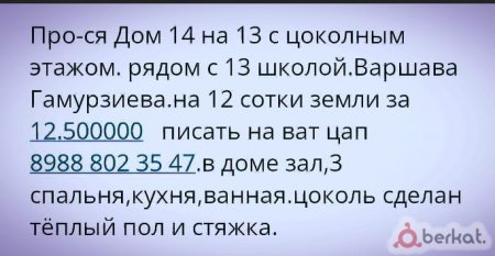 Продается дом 14 на 13 с цокольным этажом рядом с 13 школой. варшава ул гамурзиева. участок 12 соток земли за 12млн 500тыс. звонить и писать на ватцап 89888023547. в доме 3 спальных, зал, кухня, ванная. в цоколе сделан теплый пол и стяжка.