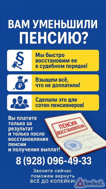 ✅быстро через суд восстановим вашу пенсию с полным перерасчетом! ✅оплата в долг! ✅от вас минимум документов, в суд ходить не нужно! ✅восстановили пенсии сотням пенсионеров! ☎️8 (928) 096-49-33