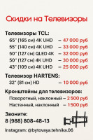 Скидки на Телевизоры! Телевизоры TCL: • 65” (165 см) 4K UHD — 47 000 руб • 55” (140 см) 4K UHD — 33 000 руб • 50” (127 см) QLED 4K — 32 000 руб • 50” (127 см) 4K UHD — 30 000 руб • 43” (109 см) 4K UHD — 25 000 руб Телевизор HARTENS: • 32” (81 см) HD — 10 000 руб Кронштейны для телевизоров: • Поворотный, наклонный — 2 500 руб • Настенный, наклонный — 1 500 руб Звоните: 8 (988) 808-48-13 Instagram: @bytovaya.tehnika.06