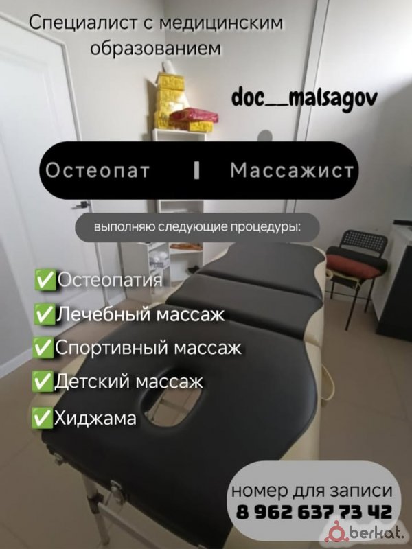 Ассаляму алейкум братья если вас беспокоит: Головная боль Шейный остеохондроз Бессонница Головокружение Проблемы в грудном отделе(межреберная неврология) Проблемы в поясничном отделе Спазмы мышц Атрофия мышц Ушибы Плохое кровообращение( холодные ноги) Мужские проблемы укрепление иммунитета Или другие индивидуальные случаи Жду вас по номеру в ватсапе для бесплатной консультации! Так же детский массаж