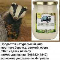 Продаю жир местного барсука, сделан на пару, цена бутылки 0.5 литра 5т. Возможна доставка , за жир отвечаю. Возможна доставка по Ингушетии. Все вопросы по этому номеру - 89888247842