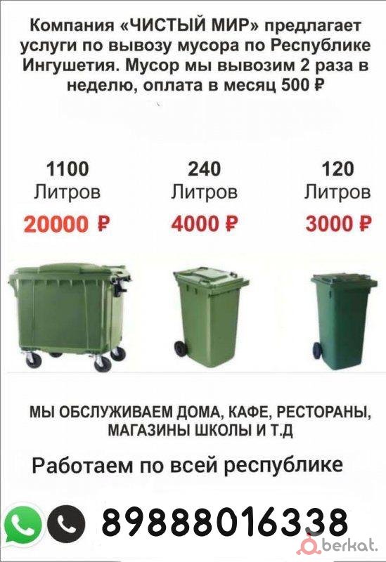 Здравствуйте! Благодарим за интерес к компании «Чистый мир». Ниже представлена подробная информация о наших услугах, ценах и условиях. О компании «Чистый мир» Мы работаем уже 10 лет и за это время обслужили более 20 тысяч клиентов, обеспечивая своевременный вывоз мусора и качественное обслуживание. Тарифы и услуги Ежемесячный тариф: 500 рублей Вывоз мусора: два раза в неделю с 8:00 до 22:00, график подбирается по месту жительства Разовые услуги: Вывоз строительного мусора Вывоз дополнительного мусора Аренда бака объемом 1100 литров — 4 000 рублей (на 4 дня). Виды баков и цены: 120 л. - 3 000 руб. 240 л. - 4 000 руб. 1100 л. - 20 000 руб. Мы предлагаем специальные условия для наших клиентов