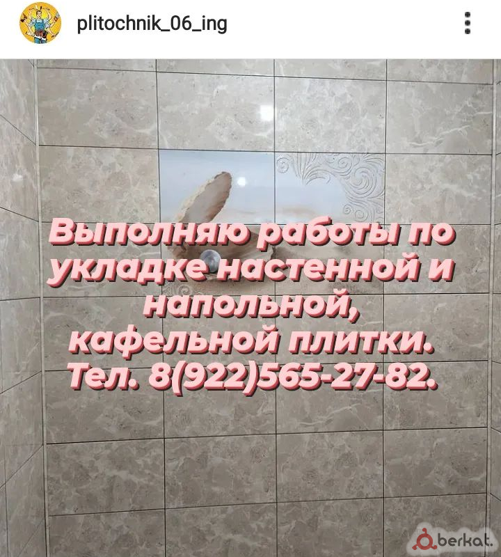 Выполняю работы по укладке кафеля, цена от 1000р м2, грунтовка 100р м2, гидроизоляция 200р м2 ,фриз 500р м.п.,откос 1000 м.п.,выимки в кафеле 300р шт , ватсапп и телефон для связи +79289201900