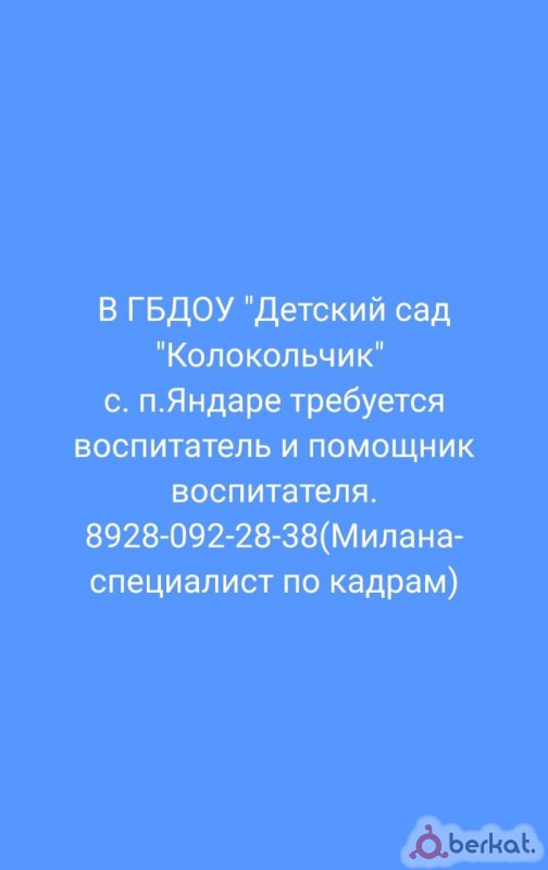 В ГБДОУ "Детский сад "Колокольчик" с. п.Яндаре требуется воспитатель и помощник воспитателя. 8928-092-28-38(Милана-специалист по кадрам)