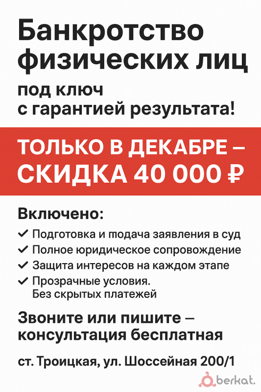 Мы уверены в своей работе: Если долг не будет списан — вернем деньги и погасим ваш долг! (Гарантия закреплена в договоре) Включено: Подготовка и подача заявления в суд Полное юридическое сопровождение Защита интересов на каждом этапе Прозрачные условия. Без скрытых платежей. Звоните или пишите — консультация бесплатная ст. Троицкая, ул. Шоссейная 200/1